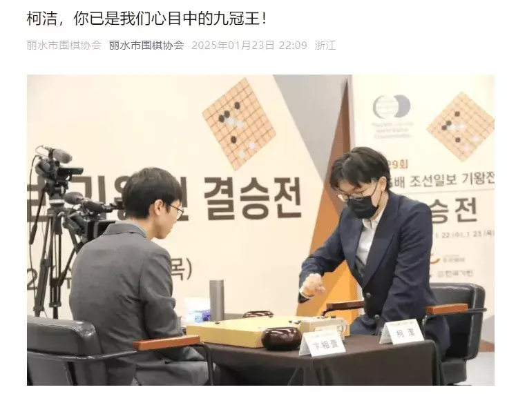 柯洁老家浙江丽水市围棋协会昨晚发文《柯洁,你已是我们心目中的九冠王!》。